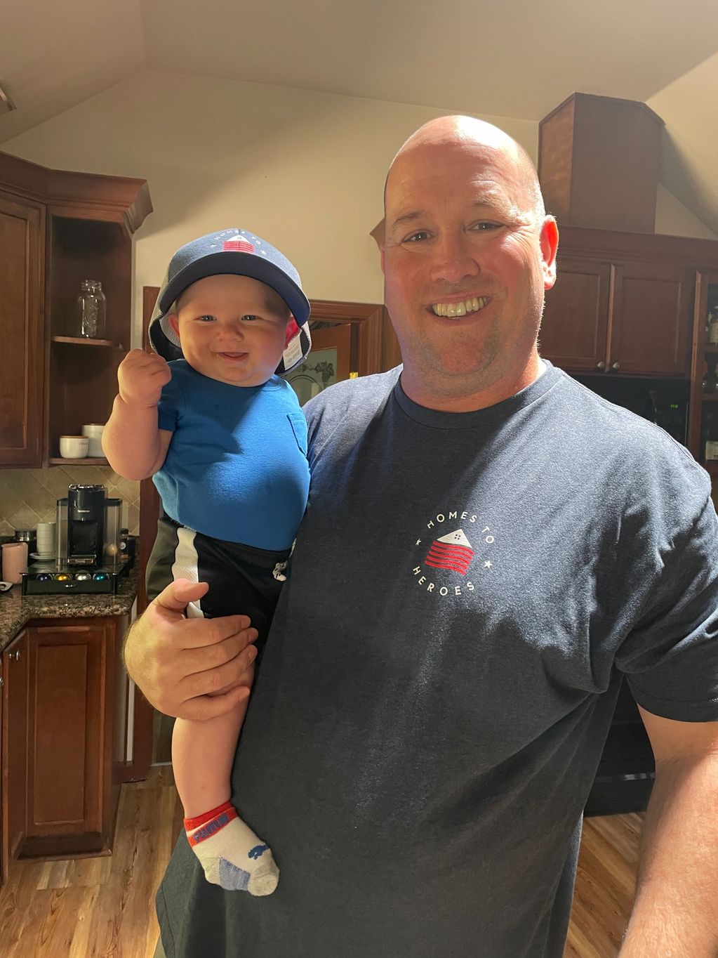 My adorable grandson, Everett with G-Pa sporting our Homes to Heroes hat and new navy t-shirt.
