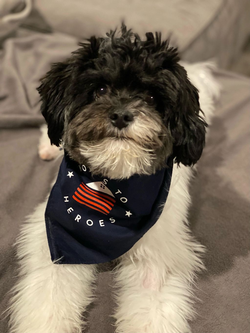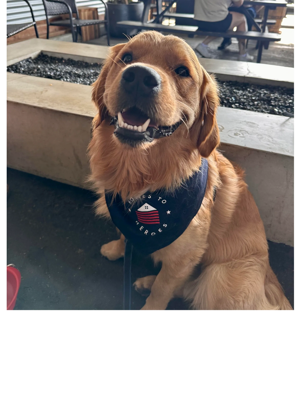 Check out our #1 puppy fan Prince sporting our Homes to Heroes dog bandana.